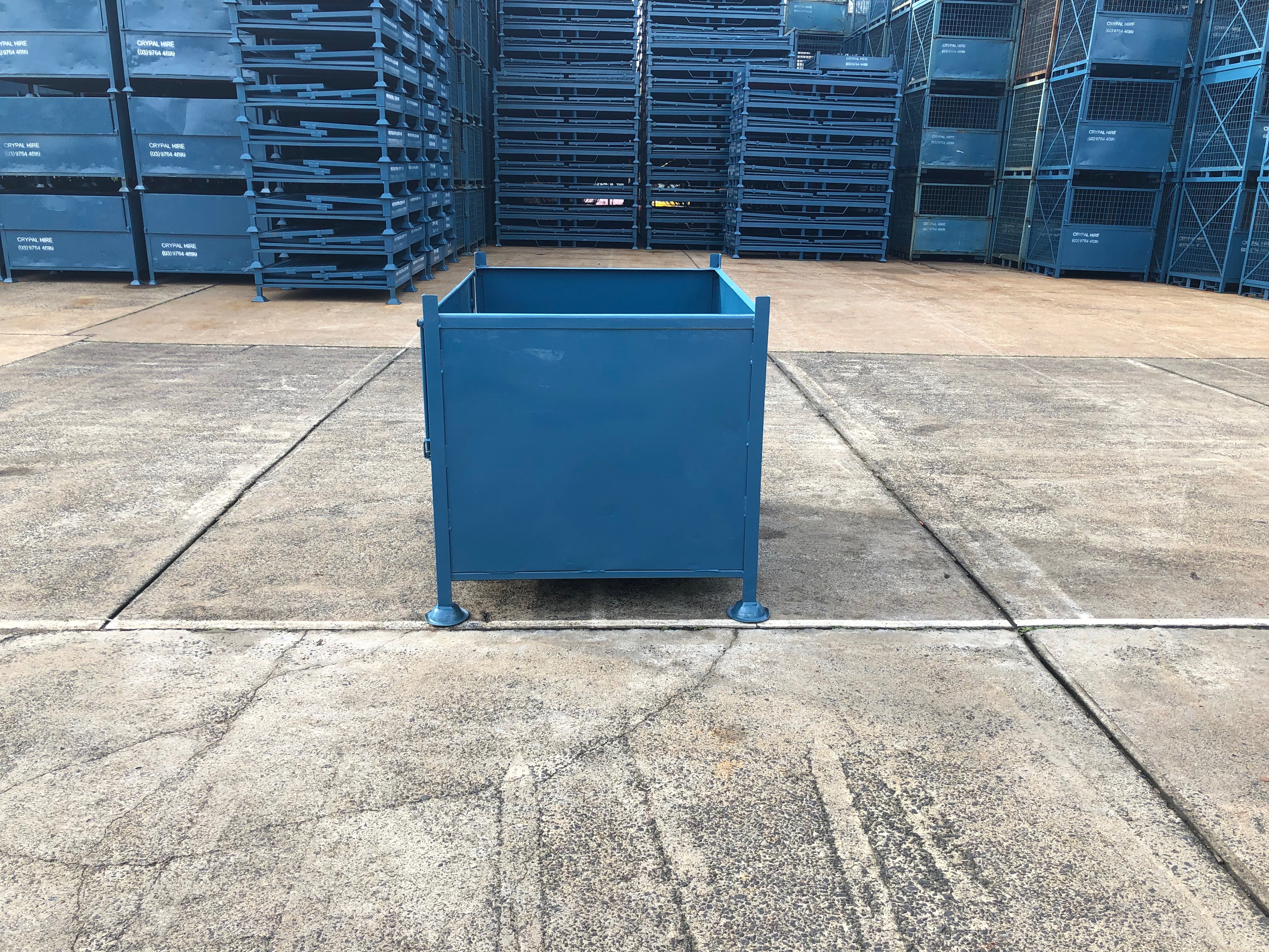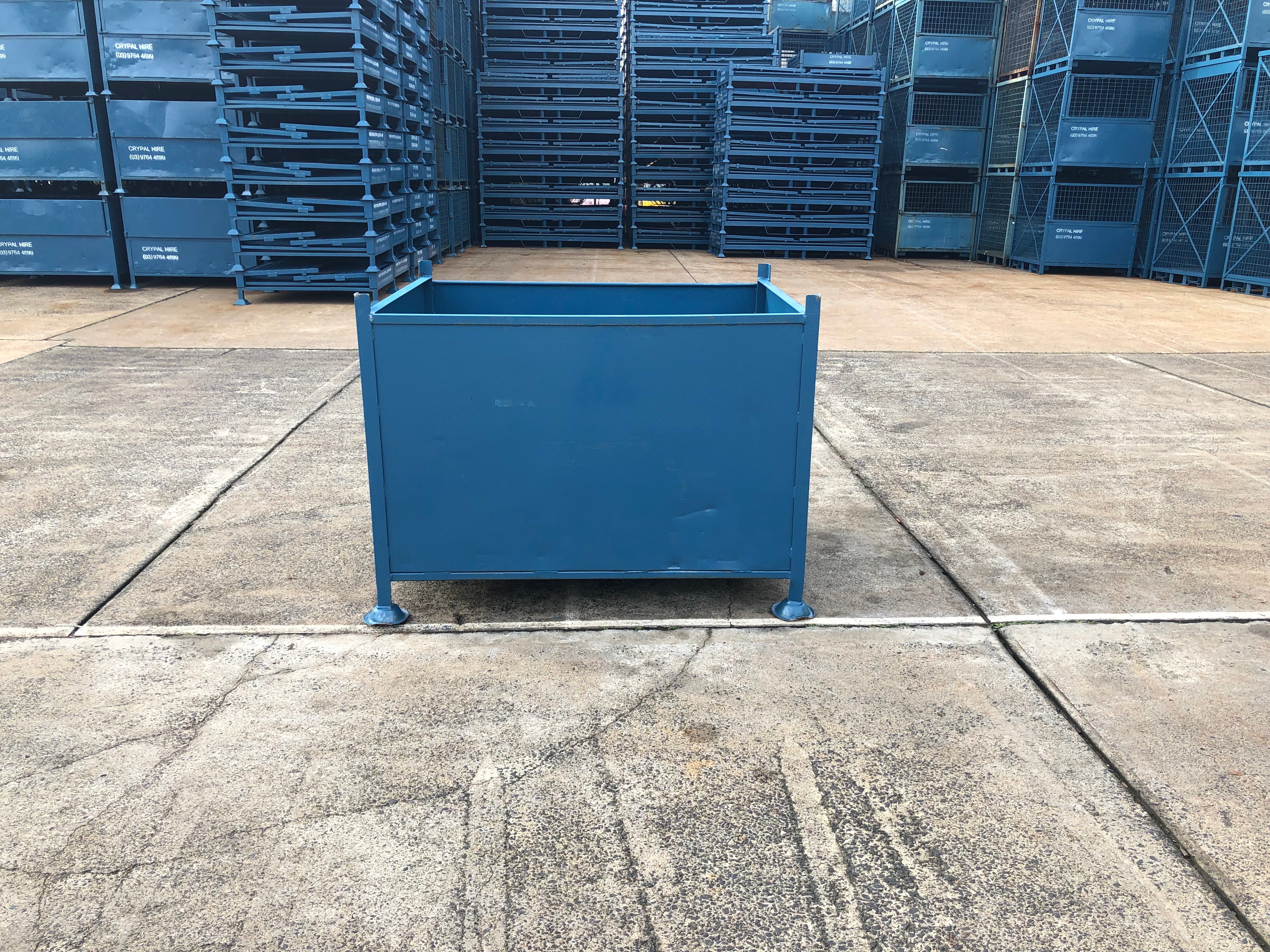Stackable general purpose container with small mesh sides and pod feet for easy capture and stacking.
